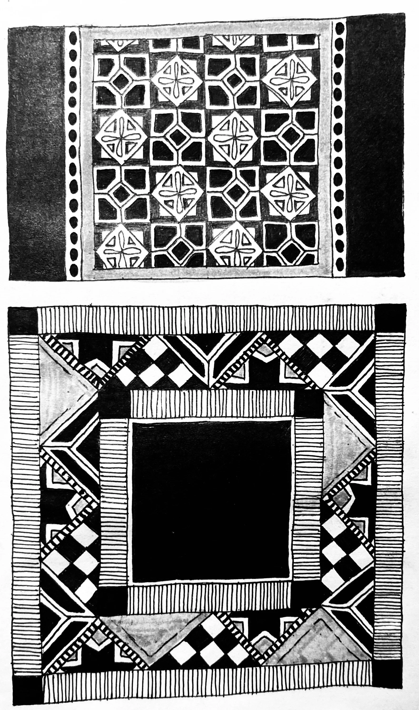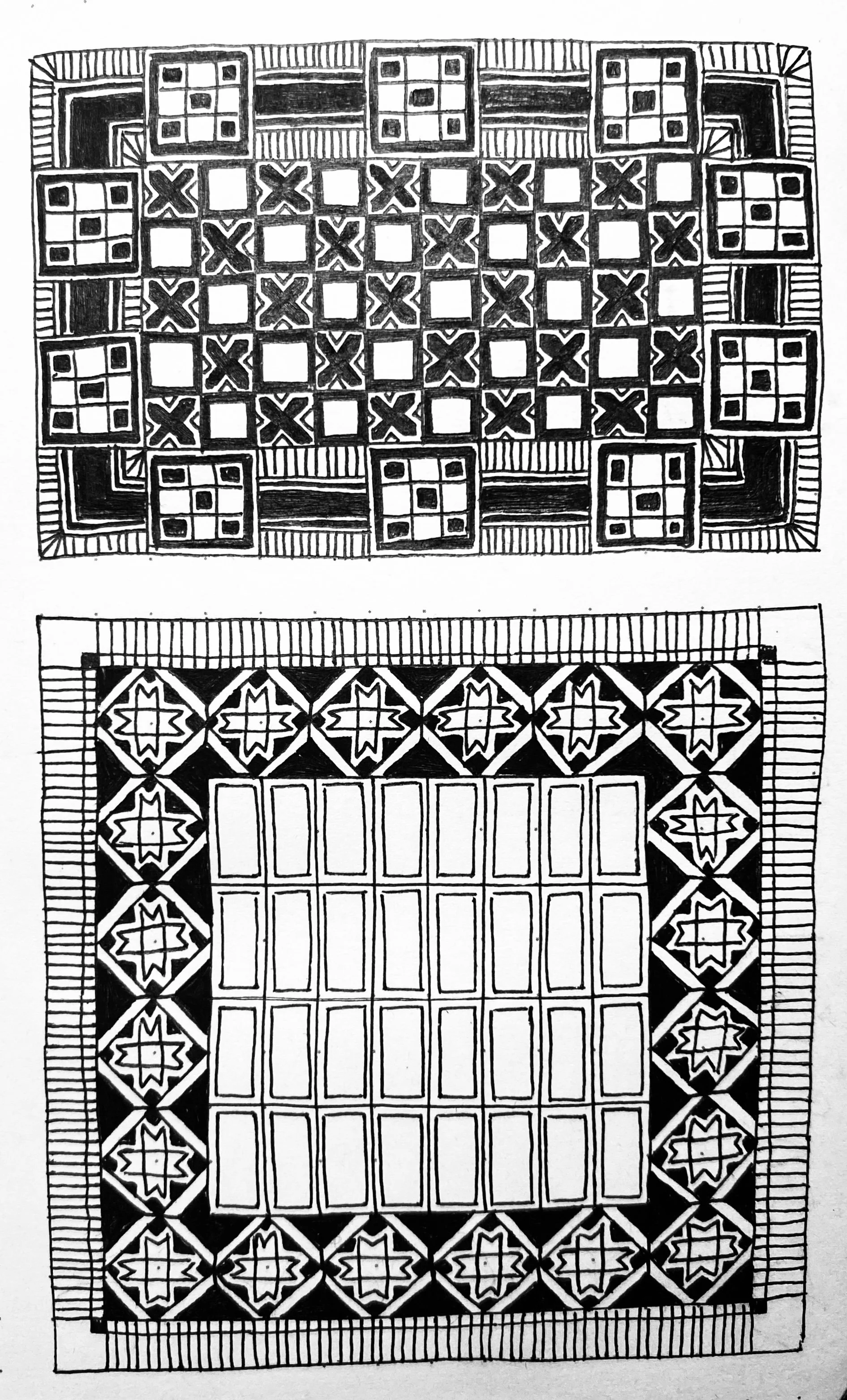 Beneath is a collection of rug patterns ordered from most complete renderings (colored) to black and white sketches. I primarily keep my rug patterns in black and white sketch format as to simplify the process of designing different patterns as I work, then later I will take them and colorize a select few to see how the elements work in color.